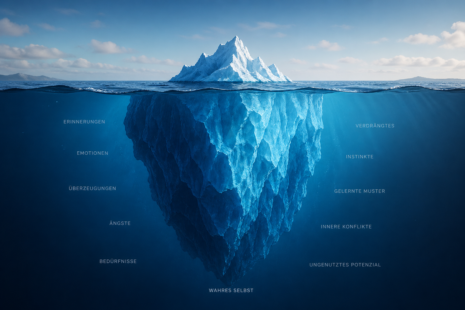 Der Eisberg steht symbolisch für das menschliche Bewusstsein: Nur ein kleiner Teil ist sichtbar und bewusst wahrnehmbar, während der weitaus größere Teil unter der Oberfläche verborgen liegt. Er steht für das Unterbewusstsein mit all seinen Emotionen, Prägungen und unbewussten Mustern, die unser Denken und Handeln tief beeinflussen..