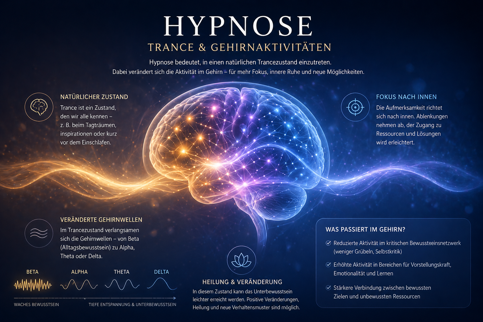 Trance ist ein natürlicher Zustand, den du bereits kennst, zum Beispiel beim Tagträumen oder kurz vor dem Einschlafen. Auch Messungen der Gehirnaktivität (EEG) zeigen, dass sich dieser Zustand nachweisen lässt. Dabei verändert sich die Aktivität der Hirnwellen je nach innerem Zustand zeigen sich unterschiedliche Muster: